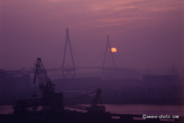 大阪市内の初日の出〜此花大橋から天保山大橋を見る (1997年1月1日撮影)Mamiya Universal Press, Mamiya-sekor 250mm F5, EPN |