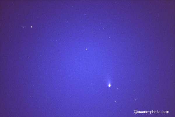 月は下弦だが,半月だからあまり明るくない。ということは,ヘール・ボップすい星撮影のチャンスだ!実際には新月近い来週末が最大の好機なのだが,来週が晴れるという保障はどこにもないのである!現地到着は4時すぎころ。月は高く出ているが,半月なので先週の満月のときのような明るさはない。ヘール・ボップすい星の位置はまだ低いものの,肉眼でもその位置が十分にわかる状態である(見た目はふつうの恒星と変わりないのだが)。双眼鏡を覗けば,尾の存在が確認できる。尾は,先週よりは伸びているように見えたが,月明かりの影響があるかもしれない。とりあえず200mmレンズで3コマほど撮影し,すい星の高度がさらに増すのを待つ。しかし,次第に薄い雲が広がり,ついには月も見えなくなってしまったのだった。