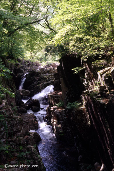 そして,「出合滝」が見えてくる。これもなかなかの迫力であるが,やはり遊歩道からではよく見えない。さらにこのあたりは遊歩道がかなり高い位置を通っているので,河原に降りるには,やはりちょっとした根性が必要である。ふつうのスニーカーなどでは近づかない方がいいと思う。