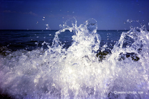 波打ち際に腹這いになってカメラを構える。ファインダーの向こうで海面が盛り上がってきた。こっちにくる。波が崩れて白くなった。よし,かちゃ,じー。うーん,昔のコンパクトカメラの音は情けない。などと思う間もなく,私は頭から波をかぶっていたのであった。海水は目にしみる。次のコマからは,いちおうゴーグルをつけて構えた。