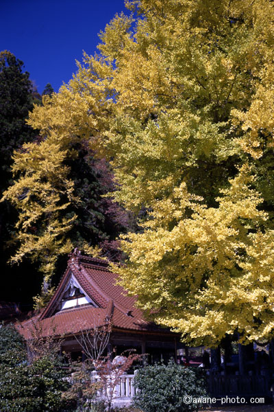 さらに,筒賀神社の本殿も撮った。本殿の向こうに見えるのは,大イチョウとは別のイチョウ。大イチョウは画面の右側半分を占めている。これは後ろの山の赤くなった葉などとの対比ができる構図を探したものの,どうしても例のポールが画面内に入ってしまい,結局,欲張らずに神社の建物とだけ対比させたものである。大イチョウも後ろのイチョウも,きれいに色づいており,写真では両者が溶け合ってしまったのが残念なところ。