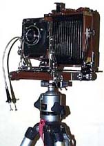 | 「タチハラ フィルスタンド45」に「フジノンW・S 150mm F6.3」を取り付けると,このように写欲をそそるスタイルになる。三脚は,「スリックマスター」を自由雲台に乗せ換えたもの。 |