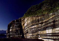 山口県の日本海側に,須佐という町がある。この海岸には,「畳岩」と呼ばれる場所があり,美しい層状の地層が見られる崖がある。この崖の岩石は,中新世(およそ500万年前〜2000万年前)中期の砂や泥が堆積した地層で,火成岩の貫入により,弱い変成作用を受けている。その岩体が,波による侵食や,海面の上昇・低下によって,美しい崖として見られるようになっている。