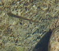 ここも,河原におりてみよう。ここも,水がきれいた。岩陰を覗くと,なにかの稚魚と思われるものが,多数群れている。水中には,他にも,いろいろな小魚や貝など,さまざまな生き物が見られる(右の画像)。このあたりは,生物に詳しい人に案内してもらえると,おもしろいだろう。やはり,自然の事象は,その名前がわかると,認識がより深まるというものだ。本で知ったことを丸暗記するのではなく,実物に触れてその名前を覚えることに,大きな意味がある。