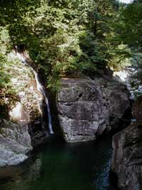 さらに歩くと,「姉妹滝」(右の画像)がある。流れは細いが,高い絶壁を一気に落下する姿は,美しい。水の深い色との対比が美しい。