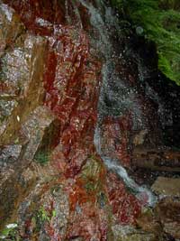 この赤い色は,鉄分の影響らしい。この先にある,いくつかの小さな滝も,同じように赤い岩肌を見せるものが多かった。なお右の画像では,フラッシュを使って撮影したため,岩肌の赤さはあらわされているが,立体感が失われてしまったようだ。