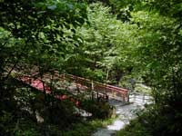 三段滝方面へ進む道は,柴木川に沿う。これを進むと,峡谷最大の見所といわれる「三段滝」に到達する。それをさらに進むと,餅ノ木の集落へ至る。さらに柴木川を奥へ進むと,娘滝,出合滝,繰糸滝,竜門,貴船滝,そして三ツ滝などの見所が連続する。そして,最後に道を登りつめると,樽床ダムに到達し,目の前には聖湖が美しく広がる。 さて,二段滝方面へ進む道は,田代川に沿う(左の画像)。これを進むと,猿飛から二段滝への渡し船の乗り場がある。昭和59年秋に,はじめてここを訪れたとき,猿飛の絶壁の高さと,深さを感じる水の色に感動したものだ。しかし,平成になってすぐのころに,ふたたびその感動を求めて訪れたときには,その数年前にあった水害の影響で,猿飛は浅く埋まっており,二段滝も崩れて美しさを失っており,大いに失望したものだった。それから10年ほどが経つわけだが,現在はどうなっているのだろう?気にはなるが,今日はこの先へ歩くことが主目的だから,寄り道はしない。