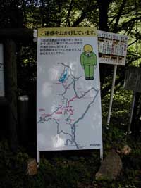 ともあれ,ここ,田代出合は,三段峡への入り口の1つである。そこには左のように,遊歩道の一部が3月の芸予地震の影響で通行できなくなっていることを示す案内図がたてかけてあった。なお,この看板によると,通行禁止期間は,2001年7月31日までだったとのことである。8月に入って最初の土曜日,通行はできるようになっていたが,この看板はそのまま立てられていた。