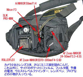 三脚は,ケンコーの「ハイパーローアングル三脚」を持っていきたかったが,やはりコンパクトさを最優先して,スリックの「プロミニ」にした。三脚がローアングルなので,ウエストレベルファインダーの使えるカメラが都合よい。そこで,35mm一眼レフは「ニコンF3」を選んだ。また,中判カメラは,ウエストレベルが使え,さらに小型バッグへの収まりのよい,「ローライフレックス」を持っていくことにした。ニコン用交換レンズとしてはズームレンズを選ぶことにする。35-70mmクラスが寄れるしコンパクトでいいのだが,広角側を十分にカバーする,AF Zoom-NIKKOR 24-50mm F3.3-4.5Sを選んだ。望遠ズームは AF Zoom-NIKKOR ED70-300mm F4-5.6Dしかもっていないので,これで決定。さらにマクロレンズの代用として,Ai NIKKOR 50mm F1.4とクローズアップレンズを用意することにした。