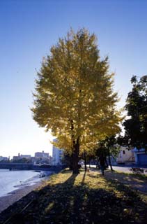 天気のよい午後,ときおり散歩する人とすれ違いながら,紅葉を眺めて右岸を歩いた。しばらく歩くと,1本のイチョウが目に入る。この1本だけ,周囲の木よりもやや高く葉も豊富で,ここ数年,ひそかなお気に入りである。