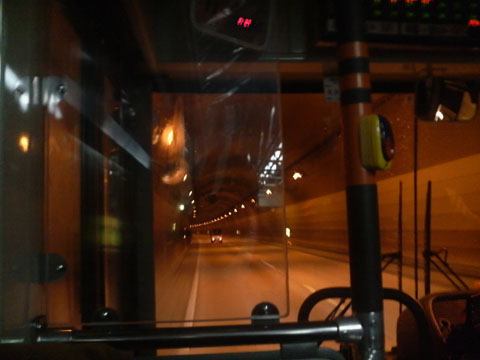 バスは市街地を走り,右折していよいよ広島高速4号線に進入する。「シートベルトの着用」を促すアナウンスでも入るのかと思ったが,次のバス停を告げるだけで,とくに注意事項は伝えられない。いちばん気になっていたのは,着席している乗客には「シートベルトの着用」を促すだろうが,着席していない乗客にはなんと告げるのだろうか?ということであるが,結局,なにもなかった。そんなことを考えているうちにもバスはぐんぐん坂をのぼっていく・・・・が,40km/hくらいまでしか加速しない。そのままトンネルを抜けて料金所に停車するまで,ずっと40km/hのままゆっくりと走っていたのであった。