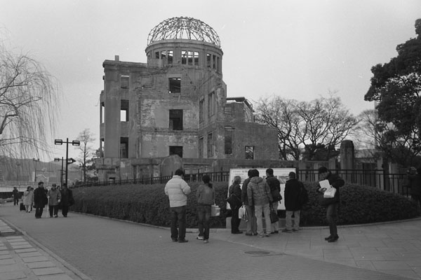 さて,「原爆ドーム」の周辺では,おもにJupiter-12 35mm F2.8付きのKIE 5を使う。KIEV 5のファインダー内には50mmレンズの写野を示すブライトフレームが見えているが,このファインダー全体の視野は,ほぼ35mmレンズの写野に相当する。ブライトフレームの範囲をはみ出すくらいに主要な被写体を入れておけば,あとはトリミングでなんとでもなりそうだ。そのかわり,35mmレンズの写野いっぱいを使おうにも,どこまでが写る範囲なのか正確にはつかめない。