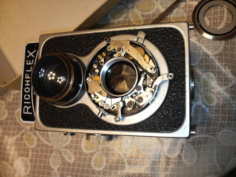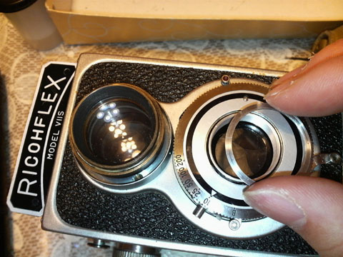 2008年02月29日(金) 天気:晴ときどき雪ふたたびリコーフレックスVIIsを分解する2008年2月10日の日記に書いたように,友人がRICOHFLEX VIIsのネームプレートを貸してくださったので,それをスキャナで読み取り,プリンタ出力してネームプレートを代用品をつくった。そして,ネームプレートが失われていたRICOHFLEX VIIsにそれをとりつけた。 まずなによりも,シャッター羽根に綿棒等が届くようにしなければならない。そのためには,レンズを外す必要がある。レンズをはずすには,ビューレンズとテイクレンズを連動させるギアになっているレンズの枠を外さねばならない。それぞれ,小さな3つのネジをゆるめることで,外すことができる。テイクレンズの1枚目,2枚目のレンズは,それぞれネジになっているので,回せば簡単に外せる。最後に,シャッター前面のプレートを抑えているリングを外せば,シャッター羽根とシャッターのメカニズムに綿棒等が届くようになる。