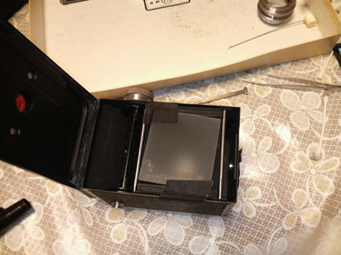 ついでにレンズの清掃もやり直したら,組み立てである。このとき,ビューレンズとテイクレンズでピント調整が連動するようにしなければならない。まず,ビューレンズにギアのついた枠を取りつけ,無限遠になりそうな目標にピントを合わせる。そして,枠の目盛が∞になるように取りつけ,ネジを軽く締める。その状態を,パーマセルテープ等で固定する。