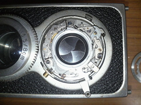 テイクレンズ周囲のギアになっている枠は,3つのネジを緩めれば外すことができる。テイクレンズはネジこまれているだけなので,回せばそのまま外すことができる。テイクレンズを外した後,上の画像に見える小さな円板を半回転させると,シャッターの前の板が自由に動くようになる。その,切り欠きをあわせれば,この板を外せて,シャッターのメカニズムに届くようになる。