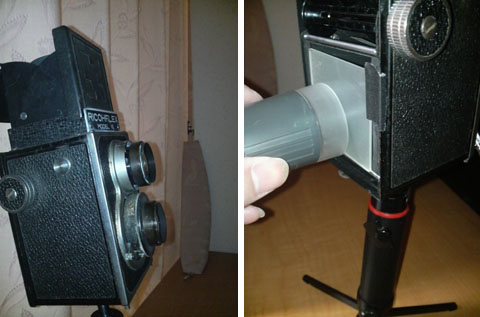 テイクレンズを無限遠にあわせるときは,別の二眼レフカメラから拝借したピントグラスをフィルム面に取りつけておこなう。そして,テイクレンズの枠を取りつければ,完成である。