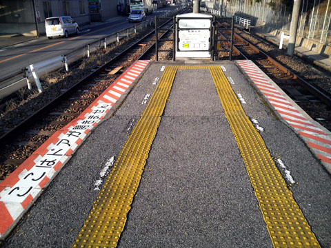 梅林駅のホームは,4両編成の電車に必要な長さがある。しかし,先述の事情から,やはりもっとも横川側の1両のドアは開かない。ホーム上には,ドアが開かない旨の案内がペイントされている。これも,七軒茶屋駅と上八木駅のホーム延長工事が完成し,その1両のドアを閉め切りにすることがなくなる日には消されることだろう。