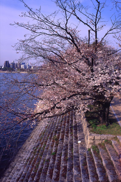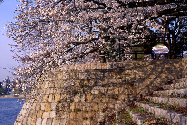 「楠木の大雁木」のサクラは,まだ高いところの枝先は開花していないが,ほぼ満開状態といってもよい状況。まさに,撮りごろである。空はすっきりと晴れており,日ざしも明瞭。石垣に,サクラの影もくっきりと映っている。
