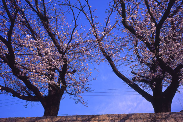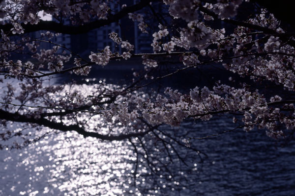 水面に反射する朝日の光が,逆光になる位置からながめてみる。水面の反射は白く見え,光が透けるサクラの花びらも白く見える。強烈な明暗差に,水面の反射のない部分や枝は,極度に暗く見えるはずだ。こういう場では彩度を求めず,むしろ透明感のようなものがほしい。フィルムはEPNを選びたい瞬間である。