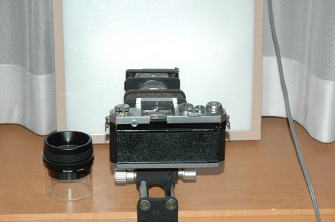 ニコンF様用のウエストレベルファインダーはもっていないが,ファインダーをはずした状態でルーペを使ってピントを合わせればよい。露出は,先にニコンF3様で測っておいたので,それを基準に段階露出すれば十分だろう。モノクロフィルムに複写するのだから,光源の色もさほど気にする必要はない。ライトボックスの光で十分だ。