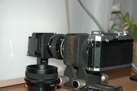 PB-5にPS-5,Nikon FとAi Micro-NIKKOR 55mm F2.8Sを取りつけた。