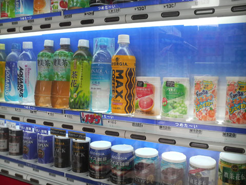 さて,この日,視野の隅に,妙な存在感があった。そこに目を向けると,それはコカ・コーラ社の自動販売機である。そして視線は,サンプルが陳列されたその中央付近に引き寄せられていった。そこには,どこかで見覚えのあるデザインの,黄色いPETボトルがあった。そして,それは本来,そこにあってはならないはずのものに思われた。
