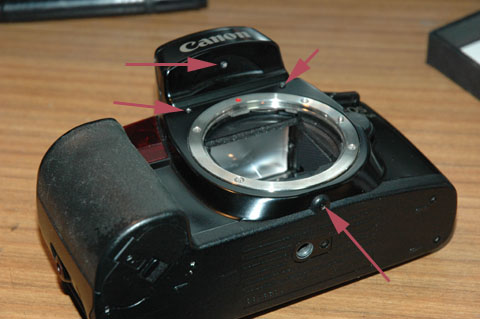 購入後は予定通り,ジャンク品として購入したEOS100の分解からはじめる。トップカバーだけをはずせばよいのだが,これが意外と面倒である。トップカバーを止めているネジは,ファインダー接眼部の左右に1つずつ,シャッターレリーズボタン付近のストラップ吊り金具の陰に1つあるほか,フラッシュの下部にも3カ所ある。さらに,電池ボックスの奥にある長いネジもはずさなければならない。これに加えて,裏ぶたロックレバーのところにある2本のネジを緩め(はずす必要はなさそうだ),前面下部のネジ1本をはずしてフロントカバーもはずすようにしなければ,トップカバーを開くことができないのである。