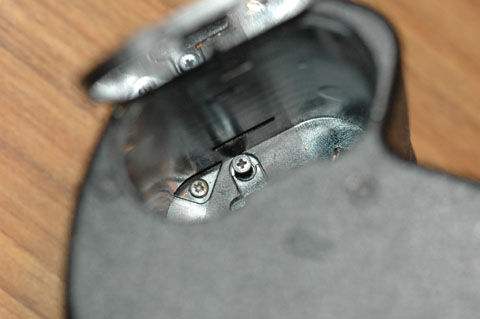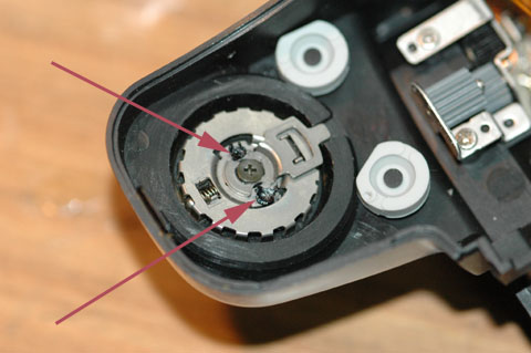 ところが,簡単に分解できると思われたこのメインダイアルスイッチがなかなかはずれない。プラスチックのダイアルには2つの突起があり,それがクリックストップのためのスリットがある金属円盤中心部の穴にはまるようになっているのだが,よく見ると,ダイアルにある2つの突起の先端が焼きつぶされていて,金属円盤にしっかりと固定されている。どうやらここを破壊しないと,スプリングを取り出せそうにない。