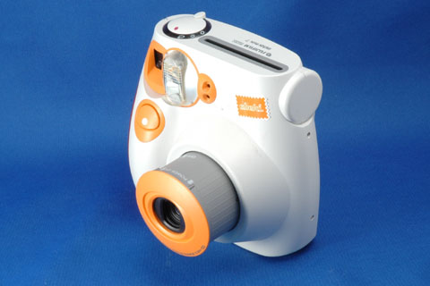 さて,店頭にあった「チェキ オレンジ」には単3乾電池4本が装填されたままであり,その場で動作も確認できた。このカメラで使う「インスタックスミニ」フィルムはまだ製造が続けられているようなので,実用になると言えるかもしれない。このカメラがおもしろいのは,レンズが沈胴式になっていることだ。撮影レンズを引き出すことで,電源スイッチがONになる。すると露出計が動作し,測光結果がカメラ上面のLEDの点灯で示される。スイッチをそれに合わせて撮影すれば,適正露光の写真が得られるというもののようだ。