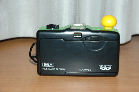 ところで,この「ぷよぷよカメラ」の裏には,「1995」および「景品用」という文字が見られる。おそらく1995年あたりに,ゲームセンターの「UFOキャッチャー」の景品として用意されたものではないかと想像する。私は,当時の「UFOキャッチャー」を見ていない(というか,「UFOキャッチャー」そのものに興味をもったことがない)ので,実際のところはわからない。しかし,当時,ゲームセンターをよく利用されていた方ならば,実際に「UFOキャッチャーに入っているのを見た」あるいは「UFOキャッチャーで取った」ということもあるのではないだろうか。