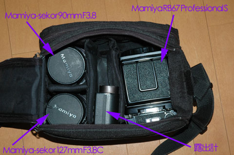 小型のバッグに,RB67一式を詰めこむ。