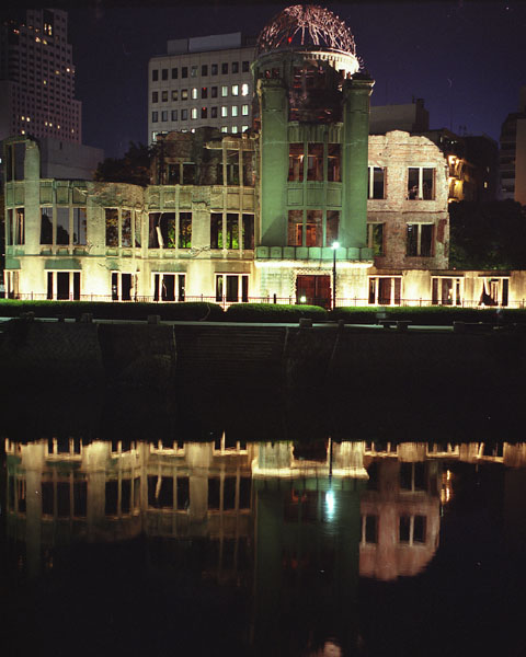 いま,Mamiya RB67用に入手しているレンズは,90mm F3.8と127mm F3.8の2本である。原爆ドーム本体だけを撮るなら,標準レンズで十分な位置であるが,川面に映った像までとりこもうと思えば,広角レンズがほしいところである。なるべく本体も川面の像も写せるポジションを求めて,カメラの位置や高さを調整するが,やや短めのMamiya-sekor 90mm F3.8でも少々厳しい。RB67特有のレボルビング機構を活かし,縦位置にすることでなんとか画面内に収めることができたのが,この写真である。