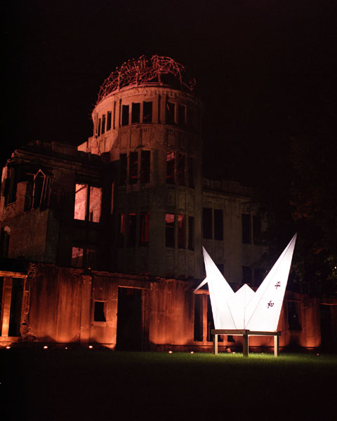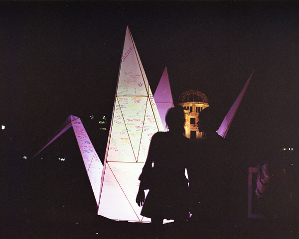 これへの支援として,8月31日から9月2日の予定で,平和公園のライトアップ事業がおこなわれる。ちょうど一昨日の土曜日,平和公園に立ち寄った際に見かけた「折り鶴」(2008年8月30日の日記を参照)も,そのライトアップ事業の1つであると思われた。