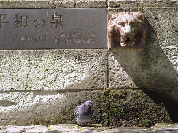 ZENZA BRONICA ETRSとレンズ2本(ZENZANON MC 75mm F2.8とZENZANON MC 150mm F3.5)を用意して,平和記念公園を歩いてみた。 で。 モノクロ写真をつくろうと考えて歩いてみたのだが,あまりにも天気がよい。秋の,澄んだ青空が広がっている。モノクロだけを撮るのが「もったいない」ような気がしてきた。 日ざしが暑いせいか,水浴びするハトが,気持ちよさそうだったのだ。