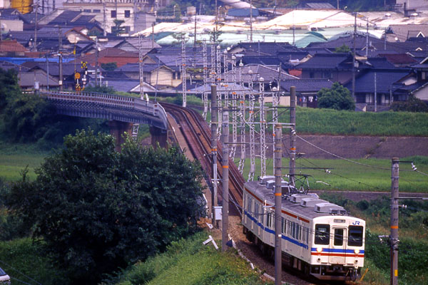 このあと,太田川を渡る鉄橋を正面に近い位置から見える場所に移動。ふたたびNikon F-801にReflex-NIKKOR 500mm F8 (new)をとりつけ,可部駅からの電車を撮った。