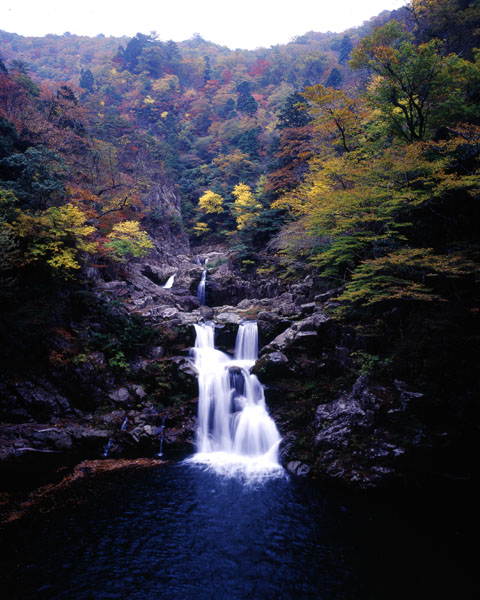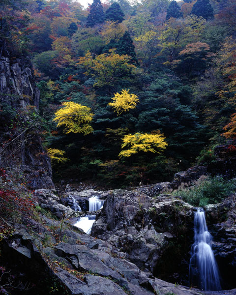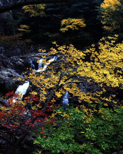 三段滝の方へのぼり,遊歩道から少しおりると,三段滝の下段の上に出ることができる。ここから展望台の方を見ると,深い峡谷に紅葉が覆いかぶさるようで,ひときわ美しく感じられる。しかし,ここまでにかなりの時間を使ったせいか,すでに展望台には,三脚を立てた人たちの姿がちらほら見える。