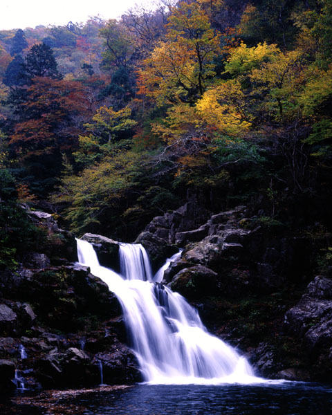今年,おもな撮影対象にしようと考えたのは,三段滝である。三段峡で紅葉を撮る場合,三段滝は定番だ。とくに,滝の正面の展望台から撮る写真は,定番中の定番と言えるだろう。