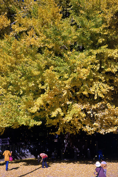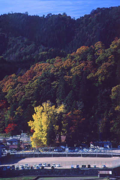 Mamiya Universal Press, Mamiya-sekor 100mm F3.5, E100VS黄葉はいい具合なのだが,これだけ人が多いとやはり落ち着かない。また,落葉のタイミングにはまだ少し早いのか,今ひとつ黄葉が降ってこない。 ということで,筒賀神社の大イチョウを遠望できる場所に移動。