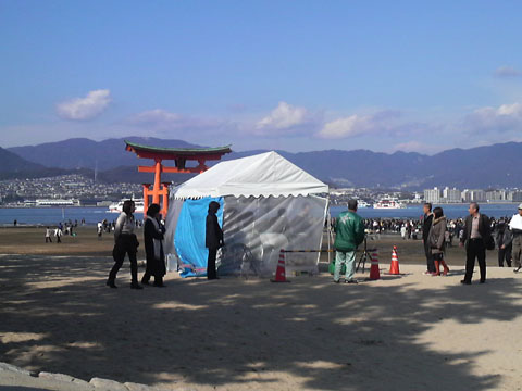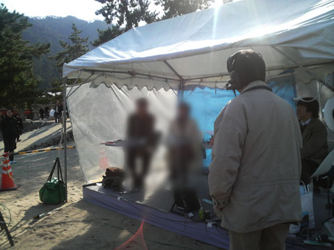 厳島神社を越えると,いくぶんか人が少なくなる。そんな砂浜の片隅に,小さなテントがあった。遠目には,臨時に設けられた救護所か迷子案内所くらいにしか見えないものだが,ここでNHKラジオの公開生放送がおこなわれるとのこと。ゲストとして,著名な俳優さんがこられている(俳優さんの姿はぼかしておく)。