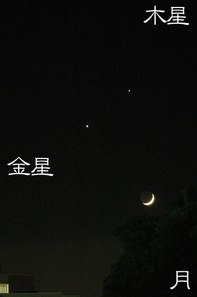 さらにその少し上に,金星ほどではないが明るい星が見えている。それは,やはり惑星の1つである,木星だ。2つの明るい星が見えている西の空は,とてもにぎやかである。