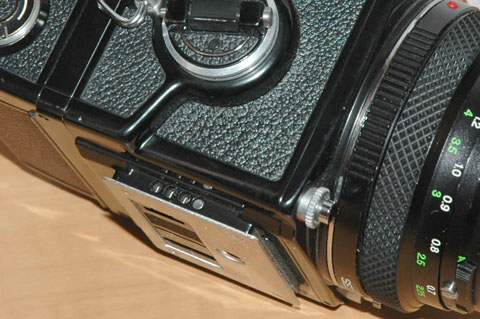 ここは,モーターワインダーやスピードグリップなどと連動する接点である。電気的な接点であると同時に,シャッターレリーズの動きを伝える接点でもある。穴のなかに1つ,ボタンが見えている。これが,シャッターレリーズの動きを伝えるものではないだろうか・・・・・ボールペンの先で,ぐぐっと押しこんでみた。