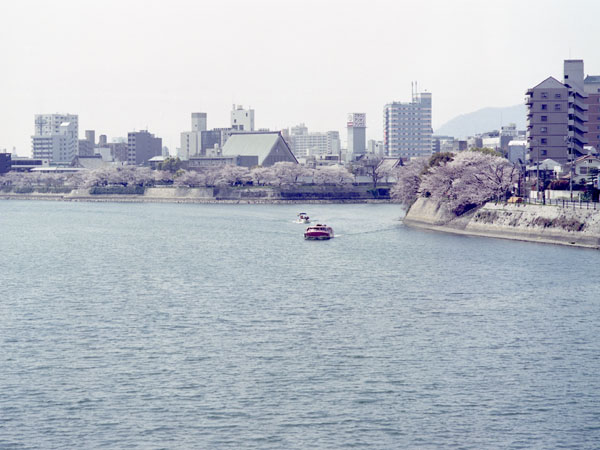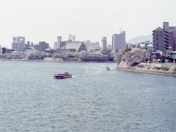 私は,「雁木タクシー」や「世界遺産航路」(「すいすい」と似たタイプの船で,平和公園と宮島を結んでいる)を利用したことはあるが,「すいすい」を利用したことはないのだ。「雁木タクシー」にせよ,「世界遺産航路」にせよ,川の水面近くから見れば,土手の向こうに見える建物は一部の高層建築だけになり,実に空が広く感じるのである。
