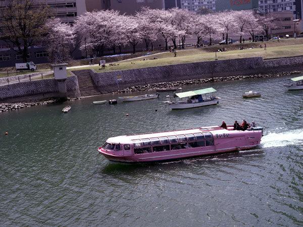一方「すいすい」は,へさきを少し東にふって,左岸のサクラに近づいてくる。川の両岸を右へ左へ,サクラを求めてぶらぶらできる,船からの鑑賞はじつに魅力的なものであろう。