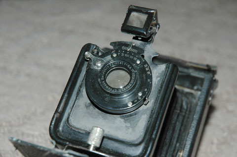 奥にひっこんでいるレンズボードをそおっと引き出してみる。シャッターをT(タイム)にしてレンズを開放し,ピントグラスを覗けば,そこにはちゃんと像が写っている。これは,まぎれもなく乾板を使用するハンドカメラである。
