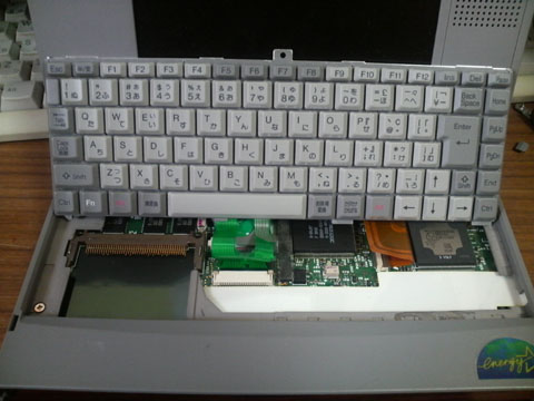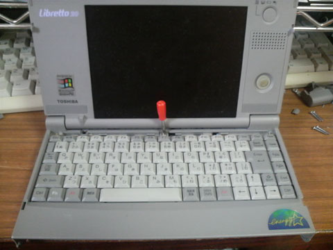 まず,リブレット20のキーボードの上にある部品をはずす。これは細いので折れやすい。実際に端を折ってしまった(笑)。まあ,それくらいのことはいい。