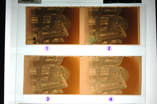 このネガを見るかぎりでは,絞り番号が1あるいは2あたりがほぼ適正露出,4では明らかに露出アンダーになっていると思われる。