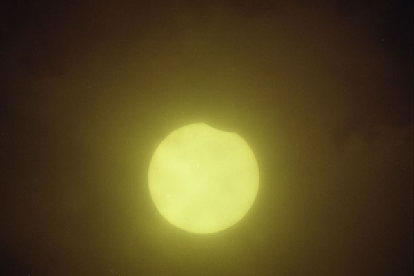 太陽は薄い雲にさえぎられているが,「日食メガネ」を通してみれば,その丸い姿は十分にわかる。