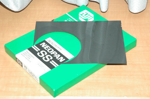 太陽を撮るために必要なものがある。それは,強烈な太陽の光を減光するためのフィルタである。夕陽の撮影であれば,太陽の位置は低く,大気の影響でかなり減光されるので,フィルタがなくてもなんとか写すことは可能である。しかし,今回の日食は,お昼前に起こるもの。太陽の位置は高く,また,たいへん明るい状態である。したがって,なんらかの減光をおこなわねば,完全に露出オーバーになってしまう。 このような用途のフィルタとして,ND400というものがある。このフィルタは,光量を1/400(9絞り)に落とすことができるものだ。まさに,太陽撮影の必需品といえそうなものである。 82mm径のフィルタをジャンクコーナーなどから安価に発掘できれば,「すすガラス」をつくる(1997年3月9日の日記を参照)ことも可能になるが,そう都合よくはみつからない。そこで,20年以上前に使用期限の切れている,5×7判のネオパンSSを使うことにした。これを真っ黒に露光して現像,定着したものを,フィルタとして利用することにしたのである。