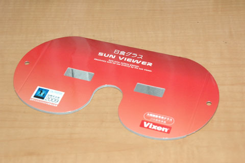 なお,太陽を肉眼で観察するためには,このような「日食メガネ」というものが市販されている(*2)。眼の部分に特殊なフィルタが使われており,可視光線だけではなく,紫外線も十分にカットしているとのこと。これを使って太陽を眺めれば,眼を傷める心配が少なくなるというものだ。この「日食メガネ」は肉眼での観察専用のものであり,「日食メガネ」をかけているからといって,太陽を望遠鏡や双眼鏡などで覗いてはいけない。そのあたりの使い方については,説明書をよく読むべし。また,日食の観察方法について,国立天文台のウェブページ(*3)も参考になる。