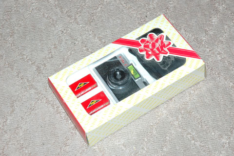 附属しているフィルムは,愛光商会のライトパンカラー,ボルタ判10枚撮り。フィルムの使用期限が1982年9月になっていることから,このカメラが出荷された時期は,その少し前だと考えられる。30年近く前の製品ということだ。化粧箱の窓に貼られた透明のプラスチック?は割れており,カメラの貼り革は隅がやや剥がれている。どのような状況で保管されていたのかはわからないが,決してよい状況ではなかったものと想像する。